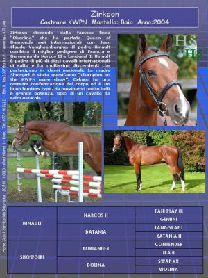 - Zirkoon è un castrone di 7 anni, un cavallo con un magnifico pedegree di cavalli da salto ostacoli. Discende dalla famosa linea 'Oberlina' che ha portato Queen of Daimonds, agli internazionali con Jean Claude Vangheenberghe. Il padre Hinault combina il miglior pedigree di Francia e Germania da Narcos II e Landgraf I. Hinault è padre di più di 10 cavalli internazionali di salto e ha moltissimi discendenti che partecipano in classi nazionali. La madre Showgirl è stata quest’anno “champion on the KWPN mare show”. Zirkoon ha una corretta conformazione del corpo ed è un buon hunters type. Ha movimenti molto belli e grande potenza tipici di un cavallo da salto ostacoli. Tel. 335 1310368 Fabrizio
