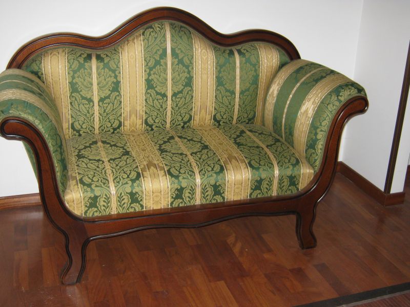 - Importante divano legno pregiato stile antico tessuto eccellente colore sfondo verde e oro antico - misure 1,60 lunghezza 70 larghezza- ottime condizioni mai usato ancora incelofanato. euro 650,00
