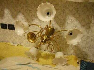 - Lampadario a 5 luci da sala in ottone. Diametro 75 cm, altezza 75 cm con catena.