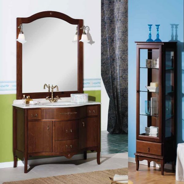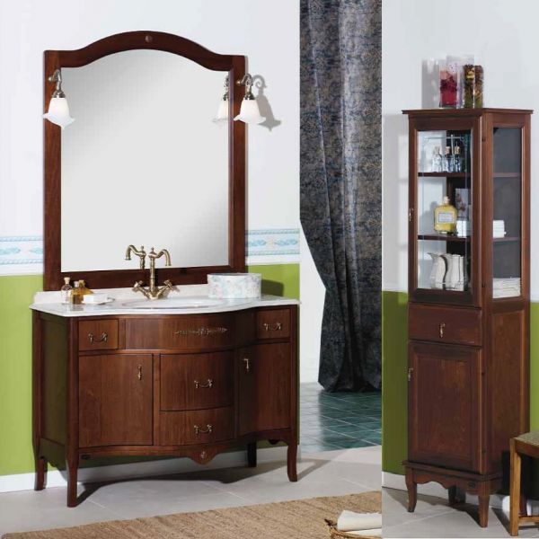 - Arredo bagno Bombato Barcellona composto da: Base bombata 3 ante + 3 cassetti Chiusure ammortizzate Top in ceramica o marmo con lavabo in ceramica Con maniglie in fusione di ottone Optional di specchiera sagomata con 2 applique calla bronzo Dimensioni specchiera: L. 100 x P. 5 x H. 115 Optional con vetrina Marbella L 52 x P. 40 x H. 170 Optional conv etrina Vittoria L. 52 x P. 40 x H. 180 Optional con cassettiera Kadiz L. 58 x P. 38 x H. 126 ( 7 cassetti ) Finiture: noce medio Dimensioni: base - L 110 x P. 58 x H. 80( lavabo 100 x 58 )