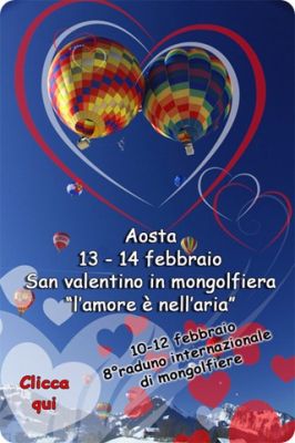 - A febbraio, ad Aosta, ti aspettano due appuntamenti da non perdere: 8° Charbonnier Balloon Festival 10-12 febbraio 2° edizione del San Valentino in mongolfiera 13-14 febbraio Un imperdibile doppio appuntamento per tutti gli amanti del volo in mongolfiera e per tutti coloro che sono alla ricerca di una sorpresa speciale il giorno di San Valentino. Per 5 giorni una ventina di mongolfiere provenienti da tutta Europa coloreranno i cieli valdostani offrendo uno spettacolo affascinante per gli spettatori e un'emozione unica per chi proverà l'ebrezza di volare tra le montagne innevate. Tutti i giorni si potrà assistere da vicino alle operazioni di gonfiaggio e decollo dei palloni e seguire la preparazione dei piloti più temerari che si cimenteranno nell'attraversa delle Alpi. Il volo di lunedì 14 febbraio sarà dedicato agli innamorati e tutti colori che vorranno festeggiare la persona amata in maniera speciale. Inf. e prenotazioni pernottamenti al B&B AMBROSIA www.bbambrosia.com