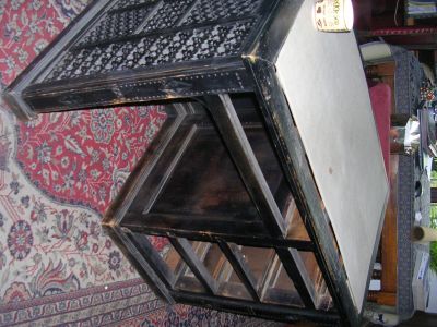 • vendo scrivania particolare, nera intarsiata su 3 lati , 4 cassetti laterali più uno con sedia disponibile a dare in omaggio pezzo di pelle per rifare il piano di appoggio,
