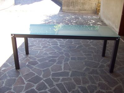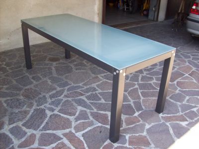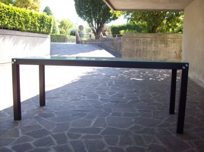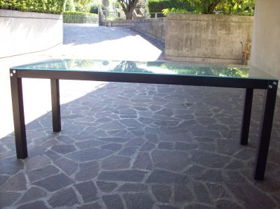 • Tavolo rettangolare 80x200x77h in legno massiccio tinta venghè, piano in vetro