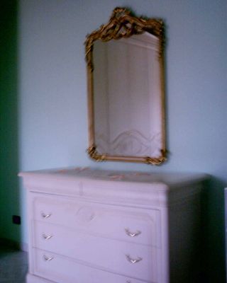 - Vendo camera da letto nuovissima (3 mesi) in legno color avorio con decorazioni floreali eseguite a mano. Armadio Royal a 6 ante con specchio interno, n. 2 comodini ed un comò. Maniglie color oro. Letto Luxor in ottone brunito con particolari laccati bianco-oro. Rete a doghe.