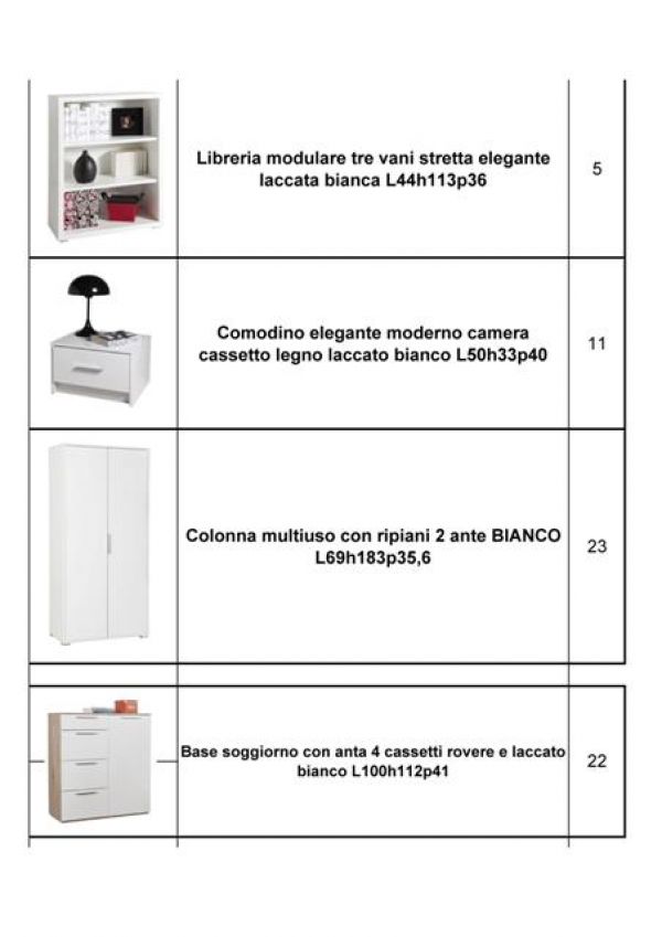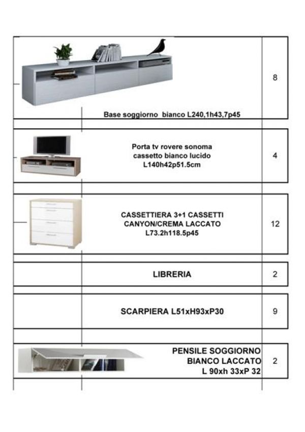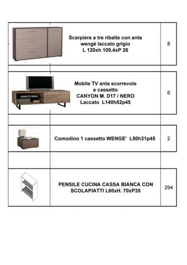- Stock mobili in kit con certificazione Eur1 Tot. 768 pezzi … tutto Made in Italy Letti matrimoniali, armadi, comodini, cassettiere, basi soggiorno, porta TV, colonne, pensili, librerie, scarpiere. Facili da montare con istruzioni all’interno dell’imballo. Per info su prezzo ed altro contattare il Sig. BOBBI LUCA al 328/8535881 o i nostri uffici allo 0744/800948