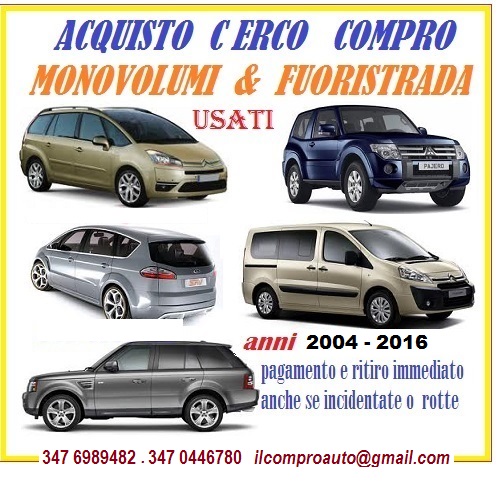 - Monovolumi minibus tutte le marche acquistiamo, qualsiasi allestimento e numeri di passeggeri omologati, li ritiriamo degli anni 2004 – 2016, pagamenti e ritiri rapidi con nostro personale, gestione documentale rapida e nei termini preposti, compriamo anche se monovolumi i van incidentati, rotti, o con ipoteca o altri gravami amministrativi contattaci al 3476989482