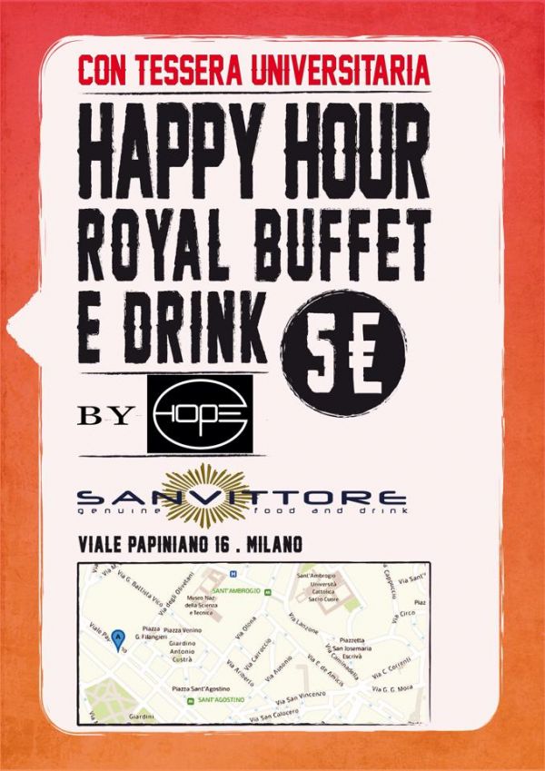 - Sanvittore propone un’occasione low cost per gli studenti universitari, da prendere al volo tutti i giorni all’ora dell’aperitivo. Dal martedì alla domenica, dalle 18 alle 21.30, basta presentare la tessera dell’università per poter fare happy hour con il buffet con consumazione a soli 5 euro Sanvittore Viale Papiniano, 16 Milano