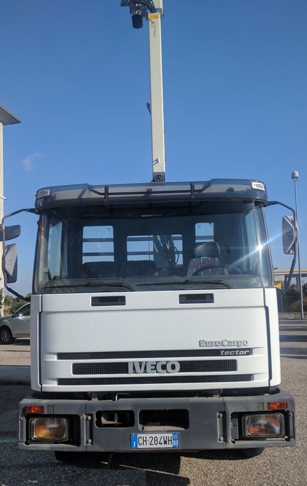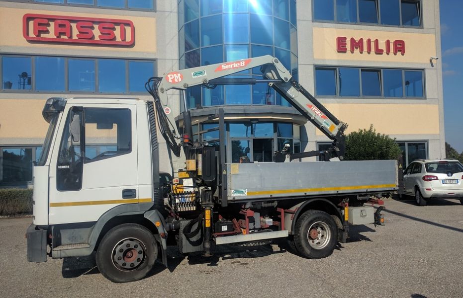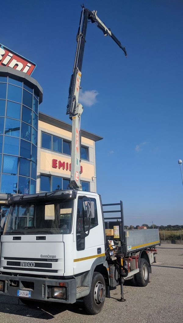 - Iveco Eurocargo 100E18K anno 2003, 40.000 km (usato pochissimo) con Gru idraulica Pm 8522 + J12 ( 2sfili di gru base e due di jib ) max sbraccio m.12,40 con 250 kg (in orizzontale) e m.15,65 con kg 800 (in verticale ), radio comando Hetronic, 4 piedi stabilizzatori, ribaltabile trilaterale dim m.3,60 x m. 2,35. Ottime condizioni generali. il tutto a norme MCTC e CE