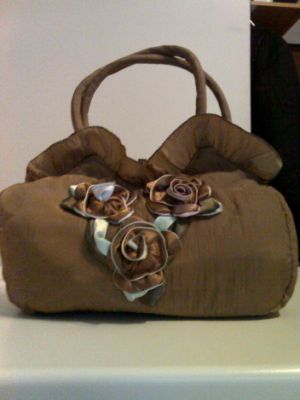 - Vendo borsetta morbidosa in raso color biscotto da portare a spalla. Decorazioni floreali applicate nei toni del beige e verde acqua, ruches nella parte superiore. Chiusura con cerniera, tasca esterna chiusa anch'essa da cerniera. Tasca interna + tasca cellulare. Dimensioni: cm. 30x25. Euro 15