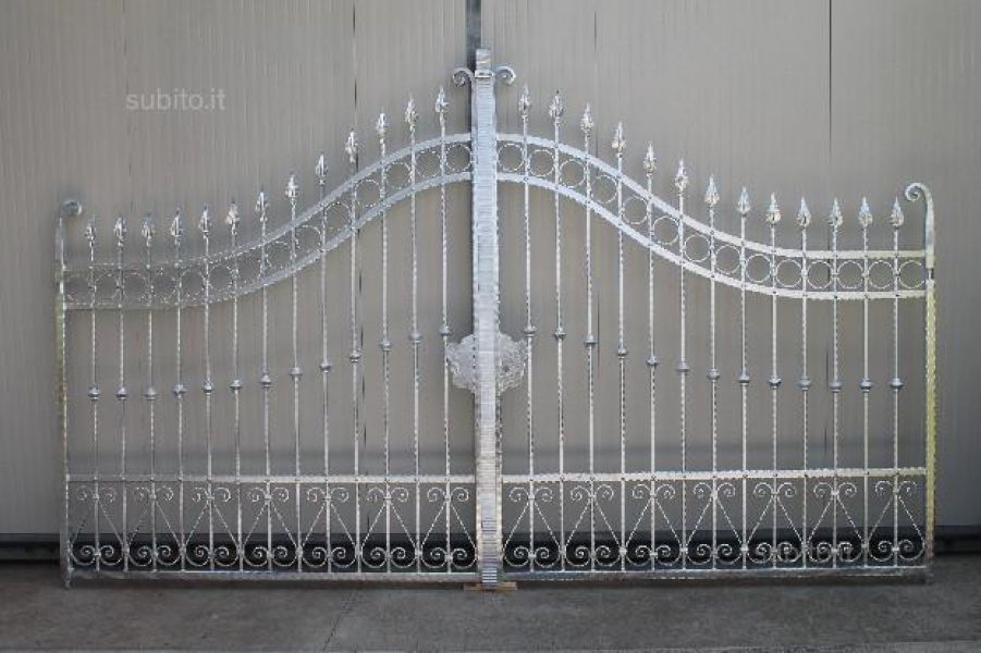 • Cancello carraio a due ante in ferro battuto, zincato a caldo, predisposto per motorizzazione, completo di sblocco anta automatico e serratura elettrica centrale