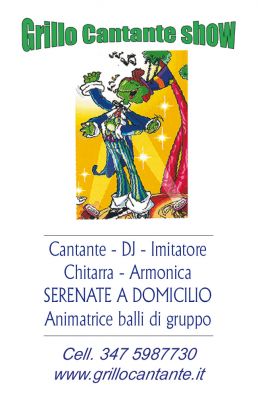 - Grillo Cantante Show Musica dal vivo - Spettacolo - Animazione balli di gruppo, latino/americani e baby dance. BEPPE: una vita dedicata solo alla musica! Ha partecipato a trasmissioni tv e collaborato con personaggi come Pippo Baudo, Franco Neri di Zelig, Sebastiano Somma, Nada, Ricchi e Poveri, Corrado. Visitate la galleria fotografica del sito. Le sue performances canore, insieme al ricco repertorio di imitazioni, daranno un tocco di classe al vostro matrimonio, senza nulla togliere al divertimento. TIPOLOGIA: dalla serata soft di pianobar, alla festa da ballo piu' sfrenata ! Potrete vedere i VIDEO, digitando GIUSEPPE MUIA su YOU TUBE oppure cliccando sul pulsante nella home page del sito (gradito il MI PIACE). GENERI MUSICALI: Pop, Rock, Blues, Jazz, Soul, Rock progressivo, Dance e Disco, Latino/Americano, Liscio tradizionale e moderno, Napoletano. FORMAZIONI STANDARD: singolo o duo con esperienza trentennale. STRUMENTI PRIVILEGIATI: voce, armonica, chitarra, pc