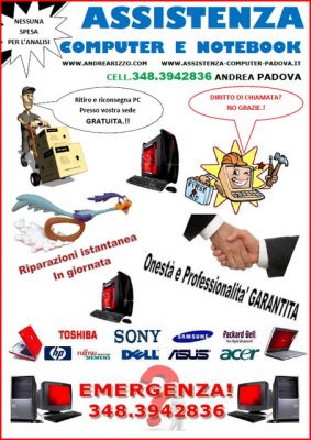 - vieni da Andrea e’ confronta.!!! UN’ANALISI IMMEDIATA IN GIORNATA.!! Una garanzia senza rivali Assistenza Computer Padova Tecnico Computer riparazioni Pd da Andrea Rizzo Solo grande passione dedicata da oltre 30 anni. interventi di assistenza presso VOSTRO DOMICILIO SENZA DIRITTO DI CHIAMATA RITIRO E RICONSEGNA SENZA SPESE L’UNICO TECNICO CHE OFFRE UN SERVIZIO UNICO Assistenza veloce per tutti i computer IN GIORNATA ECONOMICO VELOCISSIMO Andrea tecnico PROFESSIONALE DI ANNI 45 pronto e veloce a risolvere tutto in giornata! Più stimato e’ consultato onestà serio e puntuale CELL.348.3942836 ALTRE INFO IL ALLEGATO VOLANTINO O CONSULA IL SITO DI ANDREA GRAZIE TI ASPETTO