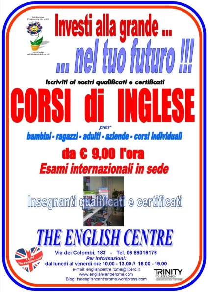 - THE ENGLISH CENTRE, Examination Centre di Trinity College London al n° 41828 e sede di esami internazionali, è un Centro Studi di Lingue Straniere che offre una ampia varietà di corsi di lingua Inglese, Francese, Spagnolo e Tedesco tenuti da insegnanti ESCLUSIVAMENTE madre lingua qualificati, certificati e specializzati nell'insegnamento della lingua straniera come seconda lingua. Offriamo corsi: - intensivi per perfezionamento e / o consolidamento della lingua Inglese; - intensivi per recupero debito scolastico; - per Aziende; - per bambini, ragazzi ed adulti; - Medical, Business, Financial e Legal English; - E.S.P. (English for Specific Purposes); - di gruppo; - individuali; - a domicilio; - corsi di Francese; - Corsi di Spagnolo; - Corsi di Tedesco. Il nostro Centro di Lingue Straniere è situato a Roma in Via dei Colombi n° 183. Per informazioni: - telefonare al n° 06 89016176 dal lunedì al venerdì dalle 10.00 alle 13.00 e dalle 16.00 alle 19.00.