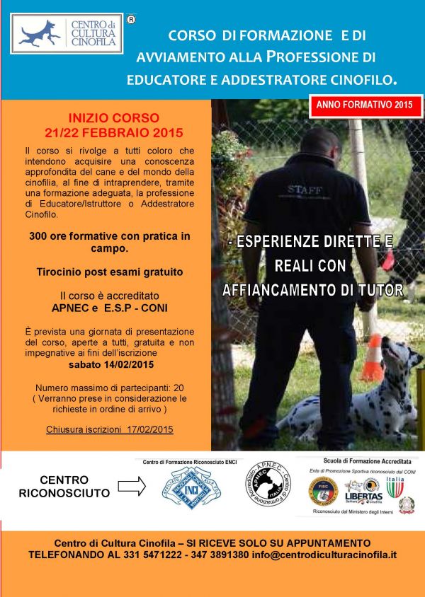 - Il corso si rivolge a tutti coloro che intendono acquisire una conoscenza approfondita del cane e del mondo della cinofilia, al fine di intraprendere, tramite una formazione adeguata, la professione di Educatore/Istruttore o Addestratore Cinofilo. Saranno fornite le basi per avviare e condurre anche altre attività nel mondo della cinofilia quali : Allevamento e Pensione. Sarai in grado di fare della tua passione una professione. Sono previste 164 ore di lezioni teoriche e 136 ore di lezioni pratiche da svolgersi in “formula weekend”, con il seguente orario: sabato e domenica dalle 9 alle 13 e dalle 14 alle 18 per un totale di 300 ore con frequenza obbligatoria del 80% del monte ore.Al termine dei nostri corsi, dopo aver superato l’esame finale, viene rilasciato: Attestato del Centro di Cultura Cinofila con la qualifica di “Educatore Cinofilo”Brevetto Nazionale di Qualifica APS-CONI Iscrizione APNEC.L’Attestato che rilasciamo è valido titolo preferenziale per accesso ai corsi ENCI.