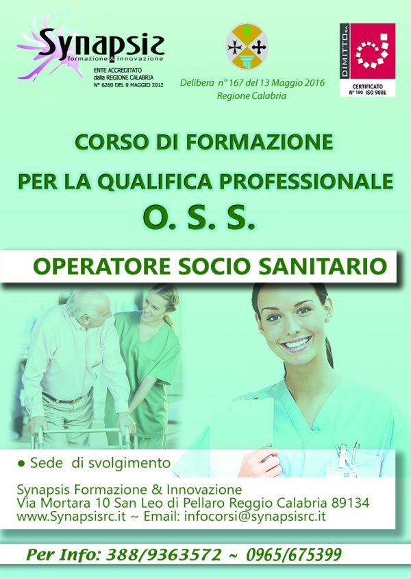 - Sono aperte le iscrizioni al corso di qualifica per Operatore Socio Sanitario organizzato dal Synapsis Formazione e Innovazione. L'operatore socio-sanitario (O.S.S.) è un figura operante nel campo dell'assistenza socio-sanitaria, di supporto agli infermieri, la cui attività è volta al soddisfacimento dei bisogni primari della persona ed a garantirne il benessere psico-fisico e sociale. L'ambito lavorativo è molto ampio (strutture sanitarie:ospedali, cliniche, ASP , cooperative sociali ecc. e sociali :centri diurni integrati, case di riposo, Rsa, assistenza domiciliare, comunità di recupero, case famiglia, comunità alloggio). Il corso è rivolto a tutti coloro in possesso dei seguenti requisiti: •Diploma Scuola dell’obbligo •18 anni di età •Certificazione di idoneità sanitaria Il corso avrà una durata di 1000 ore e comprenderà lezioni teoriche, esercitazioni pratiche e tirocinio. Dopo il superamento di un esame finale sarà rilasciato un ATTESTATO DI QUALIFICA.