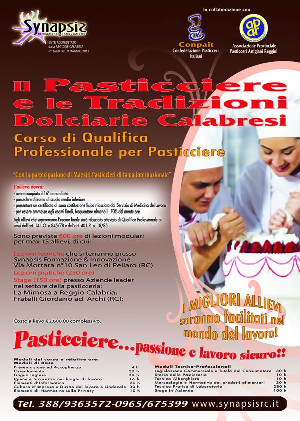 - Vuoi rendere più dolce il tuo futuro? Iscriviti al corso di formazione professionale per Pasticciere organizzato dal Synapsis Formazione & Innovazione. Recenti indagini di mercato includono la figura del Pasticciere tra le più ricercate e meno trovate. Il corso sarà autorizzato dalla provincia di Reggio Calabria. Gli aspiranti pasticceri potranno acquisire le nozioni fondamentali utili all’inserimento nel mondo lavorativo: le nozioni base ed avanzate della pasticceria, le norme igienico-sanitarie sulla sicurezza, l’organizzazione del personale e del sistema impresa, la merceologia degli alimenti. Il superamento di un esame finale consentirà agli allievi di conseguire la Qualifica Professionale, legalmente riconosciuta, di Pasticciere (ex artt. 40 L. R. n 18/85), che permetterà l’inserimento nelle pasticcerie di ristoranti, hotel, strutture di catering banqueting, panifici, laboratori dolciari industriali e artigianali. E’ previsto un numero massimo di 15 partecipanti.