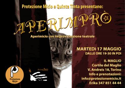 - L’Associazione “PROTEZIONE MICIO ONLUS”, impegnata sul territorio di Torino e cintura da più di un anno per la salvaguardia degli animali in difficoltà, invita amici, simpatizzanti e sostenitori al sesto Aperimicio: una sfiziosa cena a buffet, che questa volta coniuga la raffinata gastronomia del rinomato locale “Il Maglio” ad uno spettacolo di frizzante intrattenimento, grazie alla partecipazione dell’Associazione QUINTATINTA, specializzata nell’improvvisazione teatrale. L’appuntamento è per MARTEDì 17 MAGGIO dalle ore 19:30 in poi presso il locale IL MAGLIO, in via Andreis 18, Torino (con comodissimo parcheggio!). La quota di partecipazione alla serata è di 13 euro, comprendenti un ricco buffet vegetariano (ben 21 specialità differenti!) e una consumazione. Si prega di prenotare entro domenica 15 maggio, inviando una mail a: info@protezionemicio.it oppure un sms al numero 347 8514444 Ringraziamo fin d’ora tutti coloro che vorranno partecipare all’evento.