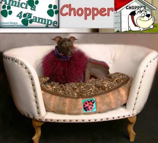 - La linea Amici a 4 Zampe presenta DogBed : Chopper e Chopper Classic Letto costruito in multistrato di pioppo, imbottitura in gommapiuma e cuscino sfoderabile, piedi da 4/6/ cm. e cm12 x il classic Chopper scocca in ecopelle, cuscino sfoderabile in microfibra, oppure tutto in microfibra sfoderabile e lavabile in acqua. Chopper Classic scocca in ecopelle cuscino in ciniglia operata Sono disponibili in vari colori. Possibilita di stampare vostre foto personalizzando tessuti o ecopelle. In 3 misure o su misura. CHOPPER 1: L.75 P. 55 H.35 CHOPPER 2: L.100 P. 70 H.50 CHOPPER 3: L.130 P. 90 H.70 Il nostro DogBed è interamente fatto in Italia dalla nostra ditta che si avvale del marchio 100% Made in Italy.Per informazioni chiedere di SILVANO al 3295958452 Invia Email silvano.ronconi@fastwebnet.it o visitate il nostro sito