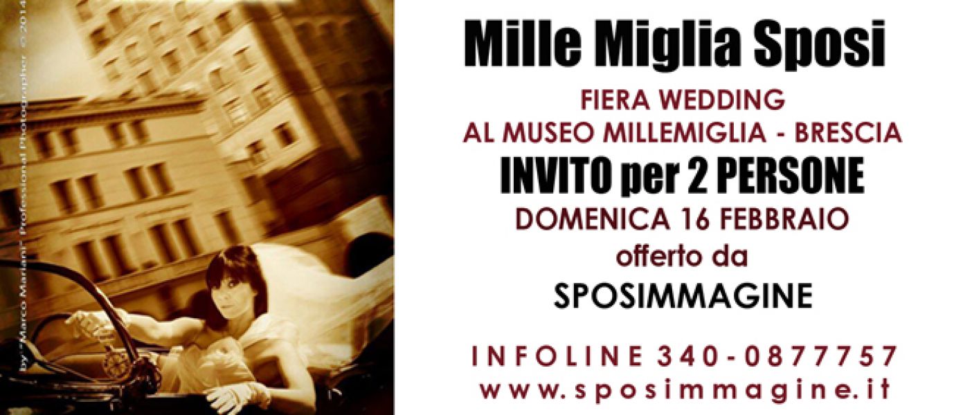 - Per la prima volta presso il Museo Mille Miglia di Brescia, tempio della storica Freccia Rossa, domenica 16 febbraio dalle ore 10 alle 19 avrà luogo la prima edizione della fiera wedding 'Mille Miglia Sposi', una mostra mercato dedicata agli sposi più attivi e dinamici, amanti dell'avventura, dello sport e della velocità ma anche accomunati dalla passione per l'eleganza e l'eccellenza. Qui i promessi sposi potranno trovare tutto l'occorrente per realizzare il proprio sogno di nozze in grande stile. In programma performance musicali (ospite speciale, l'artista jazz Gilberto Tarocco), degustazione confetti e aperitivi (offerti dall'etichetta Berlucchi), prove gratuite di trucco e acconciatura da sposa (prenotabili al 3400877757) e nel pomeriggio una sfilata di abiti da sposa e cerimonia. La fiera sarà a ingresso libero e gratuito, e le coppie che presenteranno il biglietto di invito offerto da uno degli espositori avranno diritto a speciali omaggi e promozioni.