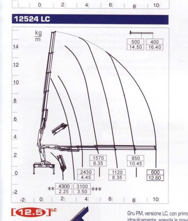 - Gru idraulica per autocarro PM 12524 LC, anno 2008 , completa di attivazioni supplementari per utilizzo accessorio idraulico (Benna e rotatore), Radio comando Hetronic a 6 funzioni, Versione LC , traversa piedi posteriori, Max sbraccio orizzontale m12,60 con 600 kg, a m.3,50 kg 3100. Ottima da montare su autocarro da 12 Ton. Ptt . Ottime condizioni generali, documenti Mctc e Ce regolari, collaudo Ausl regolare . Info e schede tecniche sul sito www.binigru.it