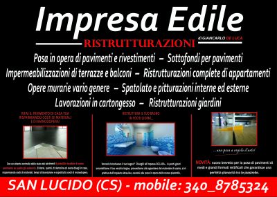 - SI OFFRE MANODOPERA QUALIFICATA NON SI CERCA OPERAI L impresa De Luca è specializzata in: . . Posa in opera di pavimenti e rivestimenti . . Solo una costante conoscenza delle tecniche di posa perfezionate anno dopo anno ed in continuo aggiornamento possono garantire una corretta esecuzione dei lavori; . . Impermeabilizzazioni di terrazze e balconi con guaine tradizionali bituminose ed anche con materiali innovativi mapei e kerakoll prodotti di ottima qualità; . . Sottofondi per pavimenti da quelli più semplici a quelli complessi con fibre di resina, telo insonorizzante polistirolo perimetrale ecc; . . Ristrutturazioni, pitture e opere murarie vario genere. . . L impresa mira a soddisfare l esigenze dei clienti ottimizzando la qualità dei lavori rispettando i tempi e i prezzi preventivati. . . Mobile:3408785324 Giancarlo.