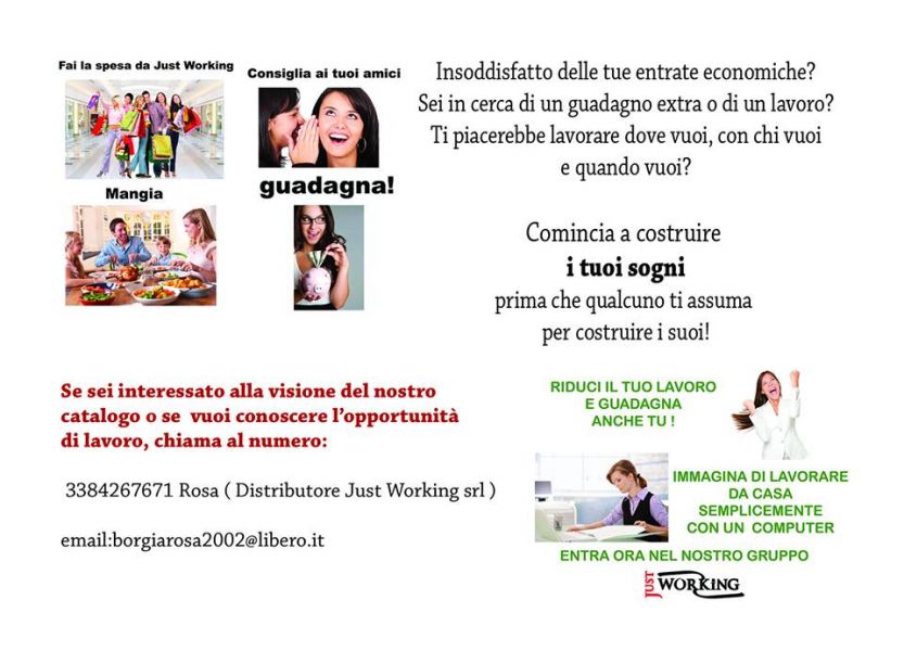- Se volete acquistare gli ottimi prodotti #justworking, registratevi selezionando: 'ho un codice sponsor per essere un 'CLIENTE'', ed inserite borgiarosa2002@libero.it come e-mail sponsor e 1GCAD come codice sponsor. Se invece volete diventare distributori e cominciare a guadagnare, registratevi come distributori/trici borgiarosa2002@libero.it come e-mail sponsor e 1GCAD come codice sponsor. Per qualunque chiarimento, non esitate a contattarmi...