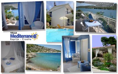 - Villa con due appartamenti di alta qualita' e piscina scaldata, 30 metri dalla spiaggia. Ogni appartamento ha 2 camere letto (4-5 persone), soggiorno, cucina, bagno, terrazza con vista sul mare. Aria condizionata, TV Satellitare, noleggio barca... Informazioni detagliate, lista dei prezzi, disponibilita' corrente e 200 foto si trovano nella nostra pagina Web: http://www.kaprije.net/ita/ Se arrivate in auto (per la nuova superveloce autostrada croata senza incolonnamenti), vi incontreremo all'entrata della cittá di Sibenik e vi condurremo al parcheggio davanti alla nostra casa (gratuito) dove potremo aver cura della vostra auto durante il vostro soggiorno a Kaprije (le auto non sono ammesse sull'isola). Vi porteremo a Kaprije e trasporteremo i vostri bagagli fino all'appartamento. Come gesto di benvenuto, e' nostra abitudine preparare agli ospiti un pranzo - pesce grigliato o frutti di mare preparati "alla buzara" (una ricetta tradizionale dalmata esclusivamente con ingredienti naturali). Poi ritorniamo a Sibenik, lasciandovi a godervi il vostro soggiorno. Nel caso doveste aver bisogno di qualcosa che non e' in vendita sull'isola, possiamo acquistarla per voi in Sibenik e spedirvelalo stesso giorno con il traghetto. Se arrivate in aereo o in nave (da Ancona/Pescara/Bari con navi-traghetto o con aliscafo veloce) a Spalato (Split) o a Zara (Zadar), possiamo organizzare il transferimento a Sibenik. Voli economici (compagnie aeree "low-cost") diretti per Spalato e Zara: da Roma (Easyjet), da Milano (Easyjet), da Pisa (Ryanair) e da Bari (Ryanair). APPARTAMENTI MEDITERRANEO - Kaprije - Croazia e-mail: mediterraneo@kaprije.net tel: +385 91 3692227 Web: http://www.kaprije.net/ita/