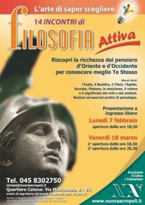 - L’associazione culturale Nuova Acropoli Verona propone un corso in 14 lezioni per un approccio pratico alla filosofia d’oriente e d’occidente, utile per conoscere meglio se stessi e per la vita di tutti i giorni. I corsi di filosofia sono rivolti a tutti coloro che si domandano il perché delle cose, per aiutarli a trovare le necessarie risposte. La prossima apertura del corso sarà in data Venerdì 18 Marzo, in doppio orario: alle 18,30 e alle 20,30. Il corso si articolerà in 14 lezioni, che si terranno con scadenza settimanale (la durata è pertanto di 4 mesi circa). La prima lezione è ad ingresso libero. Saranno trattati i principali temi della filosofia d'oriente e d'occidente, e in particolare: .l’india millenaria .la vita e gli insegnamenti del Buddha .il Tibet misterioso .l’Egitto immortale .la vita e il pensiero di Confucio .l’esempio di Socrate e Platone .lo Stoicismo di Seneca, Epitteto, Marco Aurelio .la natura e la visione ciclica della vita .esercizi pratici di Psicologia