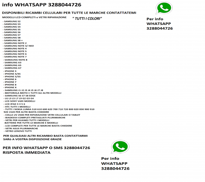 - Info whatsapp 3288044726 spedizione per tutta italia per altri ricambi componenti di tutte le marche contatttemi lcd completi per samsung nokia lg huawei asus lenovo apple e altri basta chiedere sono tutti disponibili da non spendere molto contattatemi accetto pagamento con paypal info whatsapp 3288044726