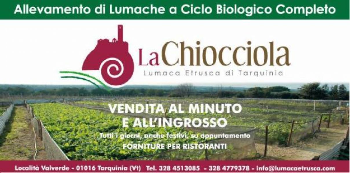 - LA CHIOCCIOLA: La lumaca etrusca di Tarquinia La famiglia Conti è entusiasta, crede profondamente nella natura e in quello che può dare con il suo intervento, e così dopo varie traversie ha preso un piccolo appezzamento di terreno, ha creato dei rettangoli, ha piantato delle verdure adatte e ha iniziato l’allevamento delle chiocciole che in silenzio ovattato si ingrassano a migliaia. Due varietà: la Ligure (Helix Aspersa) e la Rigatella Nostrana (Helix Vermiculata). Tutte chiocciole allevate a terra ed allevate secondo un ciclo biologico completo.