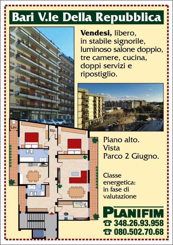 - In Viale Della Repubblica, con vista Parco Due Giugno, in zona strategica e a due passi dal centro, disponiamo di un immobile sito al quinto piano, composto da ampio ingresso, studio, salone doppio, due camere da letto, cucina con servizio, bagno e ripostiglio. Doppia esposizione, panoramico. Sup. cop. Mq. 150,70 circa Sup. Balconi. Mq. 32,12 circa Sup. Comm.le Mq. 161,40 circa
