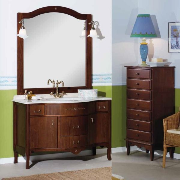 - Arredo bagno Bombato Barcellona composto da: Base bombata 3 ante + 3 cassetti Chiusure ammortizzate Top in ceramica o marmo con lavabo in ceramica Con maniglie in fusione di ottone Optional di specchiera sagomata con 2 applique calla bronzo Dimensioni specchiera: L. 100 x P. 5 x H. 115 Optional con vetrina Marbella L 52 x P. 40 x H. 170 Optional conv etrina Vittoria L. 52 x P. 40 x H. 180 Optional con cassettiera Kadiz L. 58 x P. 38 x H. 126 ( 7 cassetti ) Finiture: noce medio Dimensioni: base - L 110 x P. 58 x H. 80( lavabo 100 x 58 )