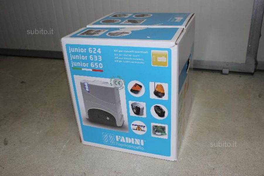 - Vendo motore fadini junior per cancello scorrevole, nuovo imballato ed in garanzia, completo di tutti i suoi relativi accessori del kit (una coppia di fotocellule, una scheda radio ricevente, un radiocomando, un lampeggiante completo di antenna, staffe per il montaggio, finecorsa, selettore a chiave). La portata max è di 400 kg. Il prezzo è più basso del listino perchè ne ho acquistati in quantità importante. Si valutano anche spedizioni. Per l'acquisto di più di un pezzo, il prezzo si può rivedere