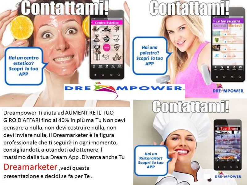 - ( ( ( DreamAPP ) ) ) Strumento Infallibile Per Aumentare le Tue Vendite Che Tu Sia Un Imprenditore, Un Azienda, Un Ristoratore, Un Estetista o Un Networker, se Oggi Non Hai La Tua '' APP '' Personale, Vieni Tagliato Fuori Dalla Concorrenza, E' Ormai Appurato Che Chi Usa Questo Strumento, Ha Visto Aumentare I Suoi Introiti Fino Al 40%, Quindi, ----Per Avere più Clienti e poter Interagire con loro in Tempo Reale---- ( ( ( Dream App ) ) ) l’App personalizzata per la Vostra attività, comunica, promuove, invita i Vostri clienti in tempo reale.. nulla sarà come prima. Sarete Sempre un Passo Avanti alla Concorrenza. http://dreampoweritalia.com/tonso-da-landing ---- Servizio Offerto da ---- https://www.facebook.com/ntonsodreampartner