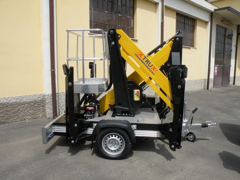 - Modello X trailer, altezza di lavoro 12 metri, sbraccio 4,5 metri con 200 kg, portata in navicella 200kg con navicella in tubolare dim 1000x700x1100, impianto corrente 220V in navicella,Motore ausiliario diesel Yammar Impianto manovre piattaforma totalmente idraulico, articolazione singola, appendice ad un asse, possibilità di traslazione indipendente tramite due motori idraulici posizionati sulle gomme, traino con patente B purché non superi i 35q di ptt massa trainante + trailer (11 q.li) Altre info e schede tecniche sul sito www.binigru.it