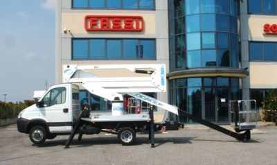 - Piattaforma aerea Socage , con doppia articolazione e braccio telescopico a uno sfilo. Cestello portapersone in alluminio, applicato all'estremità del braccio telescopico, con sistema di livellamento automatico completamente idraulico,tubazioni interne. Installabile su autocarro da t 3,5 di peso complessivo,passo 2900 mm, con n.4 stabilizzatori idraulici a discesa diretta. CARATTERISTICHE TECNICHE: H Max di lavoro m 20,00; H piano di calpestio m 18,00; Sbraccio Max di lavoro m 9,20; Rotazione Torretta Continua; Portata Max Cestello kg 200; Dimensioni cestello mm 1400x700x1000, Comandi Idraulici, Presa Elettrica 230 V nel Cesto, Rotazione Cestello 60° + 60°, sistema anticollisione cabina-cesto, piano di calpestio allungato. Il tutto su Iveco Daily 35C11 ruota gemellata altre info e schede tecniche sul sito http://www.binigru.it/template.php?pag=10115