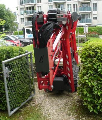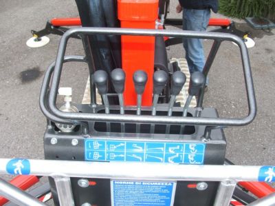 - Piattaforma aerea cingolata, con articolazione e braccio telescopico ad uno sfilo + jib., cestello portapersone in alluminio applicato all'estremità del jib, con sistema di livellamento automatico completamente idraulico, controllo dinamico automatico dello sbraccio da 80 a 200 kg.; motore termico a benzina monocilindrico Honda, carro allargabile, elettropompa 220 V, linea aria/acqua e linea 220 V. in navicella, n.4 stabilizzatori idraulici a discesa diretta. CARATTERISTICHE TECNICHE: H max di lavoro m 15,00; H piano di calpestio m 13,00; sbraccio max di lavoro m 8,50; angolo di rotazione torretta 360°; portata max navicella kg 200; dimensioni cestello mm 1200 x 665, lunghezza richiusa mm. 4920, senza navicella mm. 4250, larghezza minima richiusa mm. 780, altezza minima richiusa mm 1950, ingombro stabilizzazione mm 3100 x 3700, peso totale kg. 1900 Schede tecniche sul sito