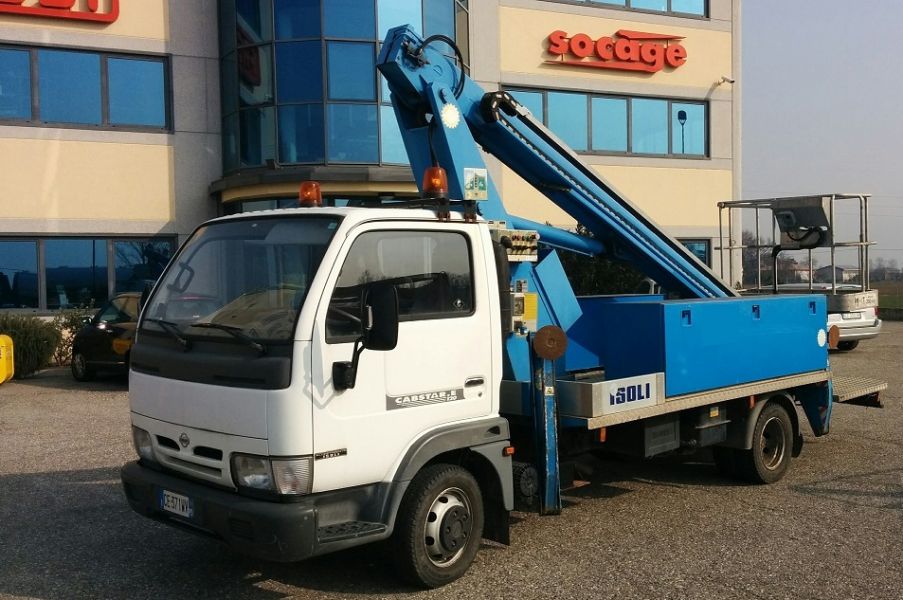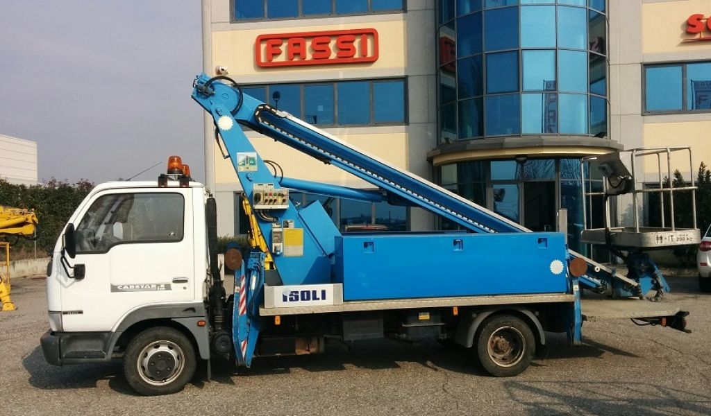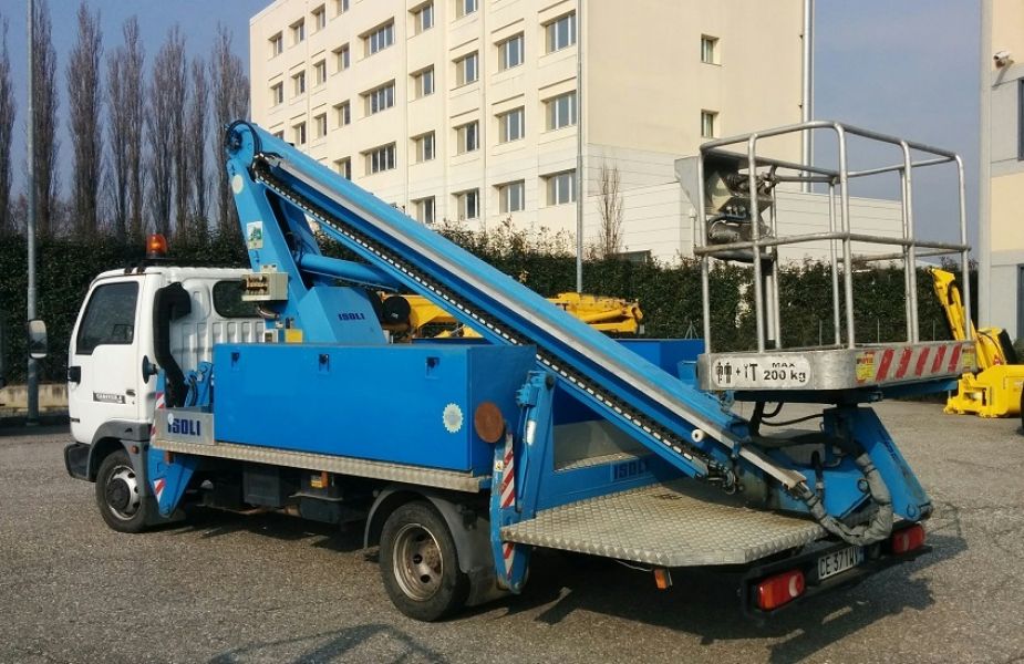 - Piattaforma aerea telescopica Isoli PT190, altezza di lavoro 19 metri, sbraccio max m. 8,50 con 200 kg, rotazione navicella, presa di corrente 220 Volt in navicella, montata su Nissan Cabstar, il tutto anno 2003, ottime condizioni generali, il tutto collaudato MCTC e AUSL per l’anno in corso Altre info e schede tecniche sul sito