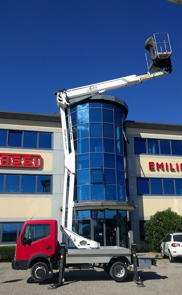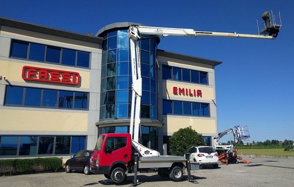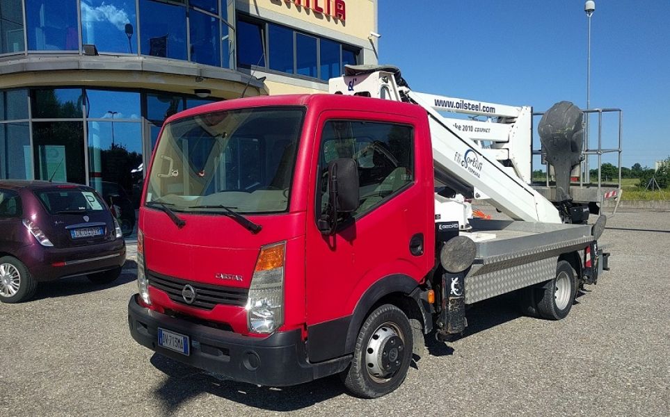 - Piattaforma aerea Oil & Steel mod. 2010 Compact, anno 2009, km 20.000, 4200 ore di lavoro completa di: Doppio pantografo + braccio telescopico con uno sfilo, movimentazione pantografo con bielle, rotazione torretta 360°, comandi idraulici proporzionali da terra e dal cestello, avviamento/arresto motore da cestello, pianale in alluminio antiscivolo, cestello in alluminio, rotazione del cestello 90° destra + 90° sinistra. Altezza di lavoro: 20 mt. Altezza piano di calpestio:18 mt, sbraccio: 10 mt. Portata (comprese due persone): 220 kg. Dimensioni cestello: 1400x700x1100 mm. Motore elettrico 220 Volts per lavori in interni. Ottime condizioni generali, il tutto su Nissan Cabstar, collaudi Mctc e Ausl regolari Altre info e schede tecniche sul sito