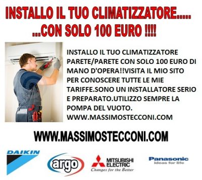 - WWW.CLIMASI.COM installo il tuo climatizzatore parete/parete con tariffe di mano d'opera a partire da 100 euro.Visita il mio portale per conoscere tutte le tariffe in base al lavoro che devi fare.Da Roma,Ostia fino a Nettuno come me nessuno.Se bene vuoi stare è me che devi chiamare!!!Massimo Stecconi
