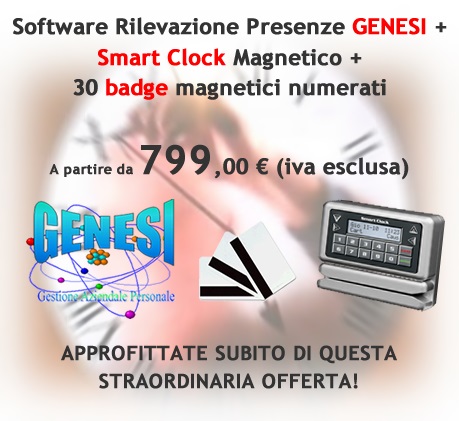- Genesi, il primo approccio alla gestione del personale, che è stato concepito per operare anche senza sistemi di timbratura. Il software è la soluzione ideale per piccole aziende e la gestione della loro attività interna denominata “giornaliera”. Principalmente si può ottenere informazione e stampe relative ai dati anagrafici dei dipendenti, alla prestazione lavorativa, alle assenze. L’enorme vantaggio acquisito dall’uso di Genesi consiste in un notevole risparmio di tempo e miglioramento della qualità nel processo di elaborazione delle buste paghe. Genesi è una procedura da installare su un pc che: • Permette all’azienda, di gestire le proprie presenze evitando così l’invio di documenti di presenze compilati manualmente; • Un vantaggio per il personale dell’azienda è una veloce compilazione, in quanto, l’utente troverà tutti i dipendenti con il proprio orario di lavoro precaricati e si dovrà preoccupare di segnalare assenze, straordinari e trasferte.