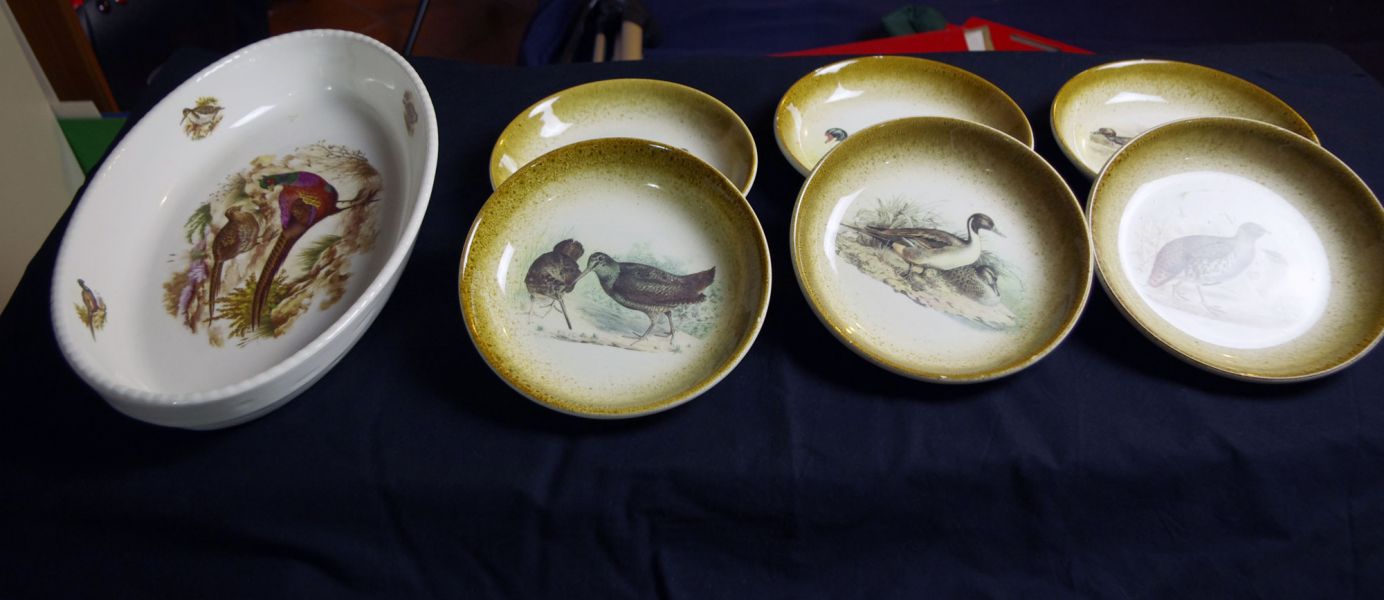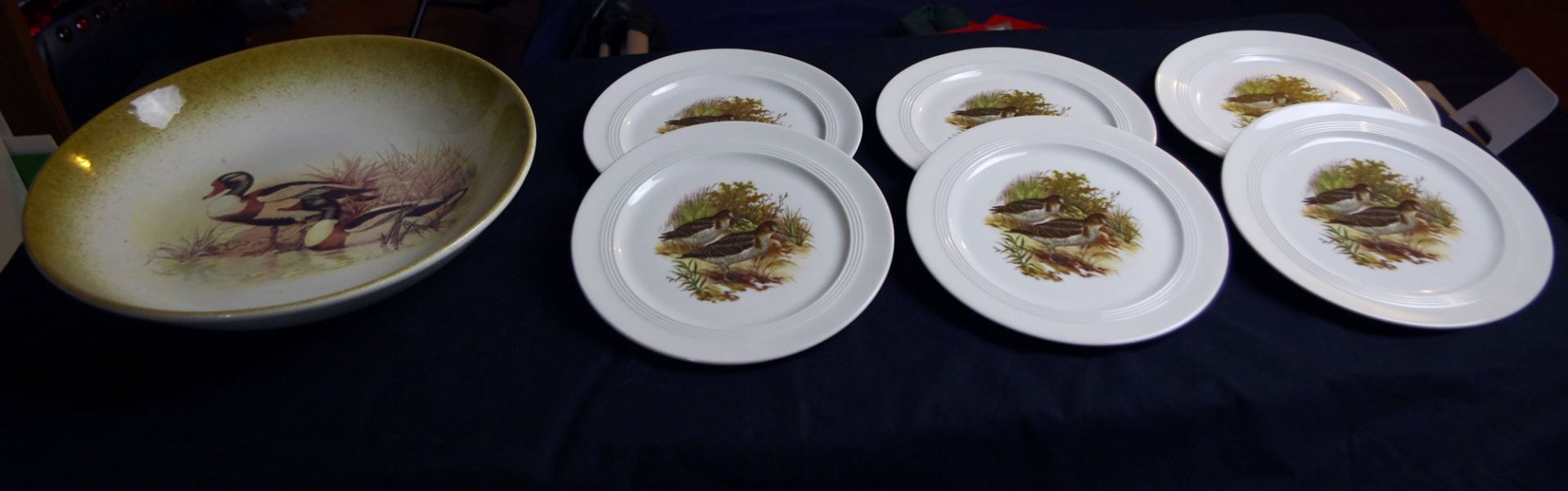 • Servizio di piatti in ceramica con scene di da caccia degli anni '70 da 6 made in germany, comprensivo di piatti fondi, piani e due vassoi da portata.