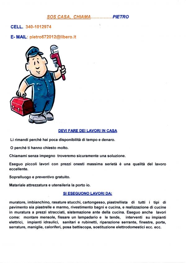 - DEVI FARE DEI LAVORI IN CASA Li rimandi perchè hai poca disponibilità di tempo e denaro. O perché ti hanno chiesto molto. Chiamami senza impegno troveremo sicuramente una soluzione. Eseguo piccoli lavori con prezzi onesti massima serietà è una qualità del lavoro eccellente. Sopralluogo e preventivo gratuito. Materiale attrezzatura e utensileria la porto io. SI ESEGUONO LAVORI DA: muratore, imbianchino, rasature stucchi, cartongesso, piastrellista di tutti i tipi di pavimento sia piastrelle e marmo, rivestimento bagni e cucina, e realizzazione di cucine in muratura a prezzi stracciati, sistemazione ante della cucina. Eseguo anche lavori come: montare mensole, fissare un lampadario e le tende, interventi su impianti elettrici, impianti idraulici, sanitari e rubinetti, riparazione serrante, finestre, porte, serrature, maniglie, caloriferi, posa battiscopa, sostituzione elettrodomestici ecc. ecc. CELL. 340-1012974 . PIETRO