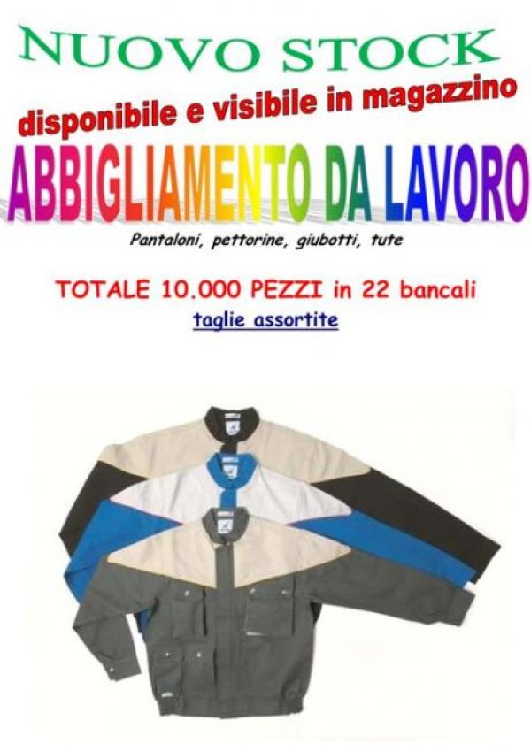 - Stock abbigliamento da lavoro, pantaloni, pettorine, giubbotti e tute TOTALE 10.000 PEZZI in 22 bancali taglie assortite e articoli nuovi e imbustati Per info e prezzo contattare Bobbi Luca +39 3288535881 o uff. 0744 800948