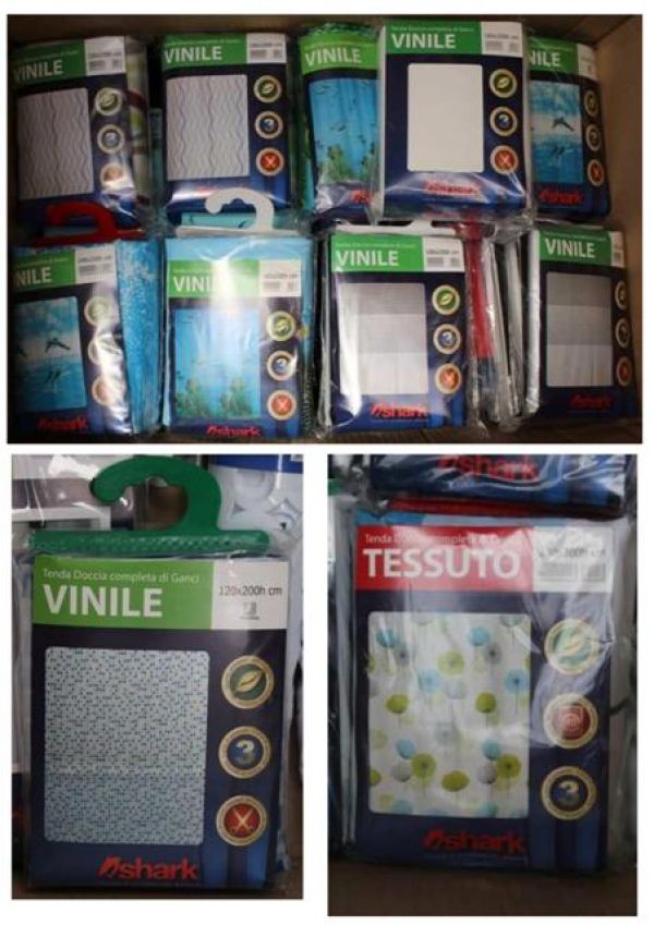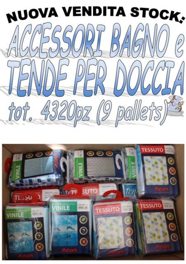 - Stock accessori bagno e tende per doccia accessori per bagno, tende doccia in tessuto, lino, vinile, tappetini antiscivolo per doccia e vasca, pedane, aste fissaggio e tanto altro! Totale pezzi 4320 suddivisi in 9 pellets e visibile presso i nostri magazzini. Per info contattare Bobbi Luca +39 3288535881 o uff. 0744 800948