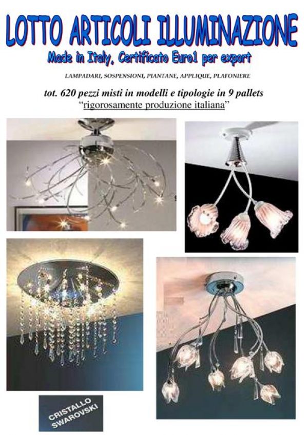 - Stock articoli di illuminazione: lampadari, sospensioni, piantane, applique, plafoniere, abat-jour misti in modelli: cristallo Swarovski, vetro, ceramica, ecc. Tutto rigorosamente Made in Italy con Certificato Euro 1 per export Totale 620 pezzi in 9 pallets. Per info su prezzo ed altro contattare: BOBBI LUCA 328 8535881 o 0744 800948