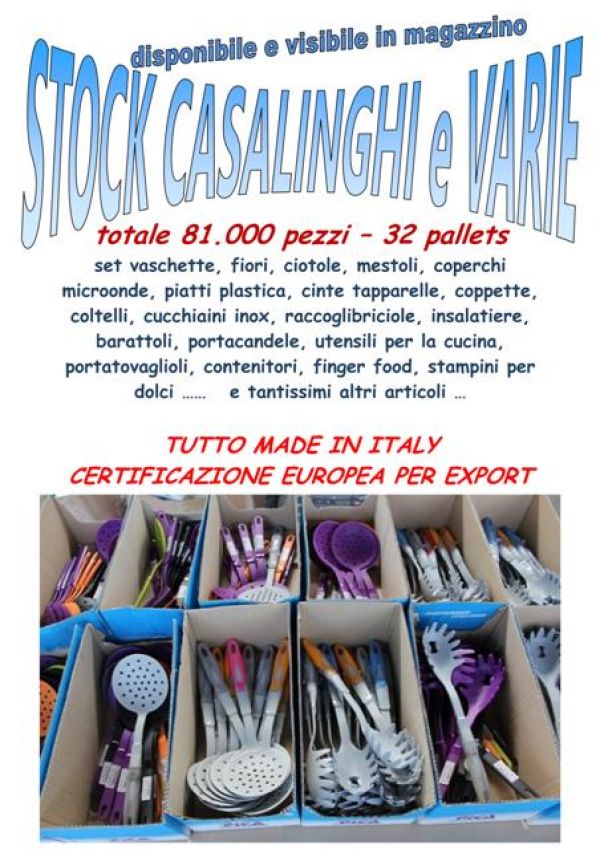 - Stock casalinghi circa 81.000 pezzi assortiti: set vaschette, ciotole, mestoli, coperchi microonde, piatti plastica, cinte tapparelle, coppette, coltelli, cucchiaini inox, raccoglibriciole, insalatiere, barattoli, portacandele, utensili per la cucina, fiori, portatovaglioli, contenitori, finger food, stampini per dolci e tantissimi altri articoli made in Italy con certificazione EUR1 per l’esportazione, suddivisi in 32 bancali. Per info su prezzo ed altro contattare il Sig. BOBBI LUCA al 328/8535881 o i nostri uffici allo 0744/800948