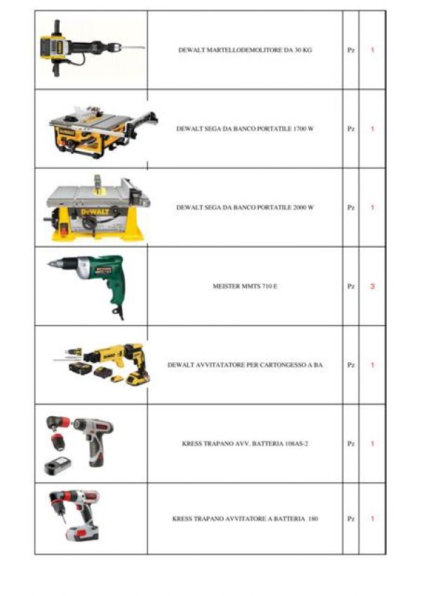 - Stock di elettroutensili marca Dewalt, Stanley, Kress e Makita come martello demolitore, seghetto alternativo, sega circolare, trapano, avvitatori, elettrofresatrice, livella laser e tanto ancora per un totale di 66 pezzi. Per informazioni e trattative per prezzo in blocco contattare il Sig. Bobbi Luca al 328.8535881 o 0744.800948.