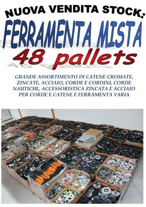 - Stock di ferramenta mista per un totale di 48 bancali: grande assortimento di catene cromate, zincate, acciaio, corde e cordine, corde nautiche, accessoristica zincata e acciaio inox e ferramenta mista . Merce visibile presso i nostri magazzini. Per info su prezzo ed altro contattare: BOBBI LUCA 328 8535881 o 0744 800948