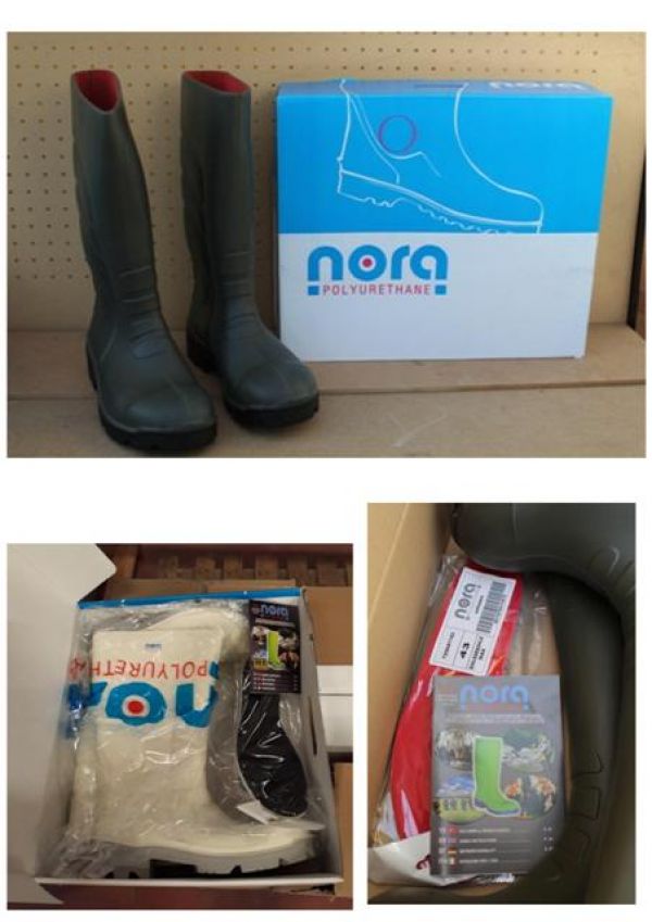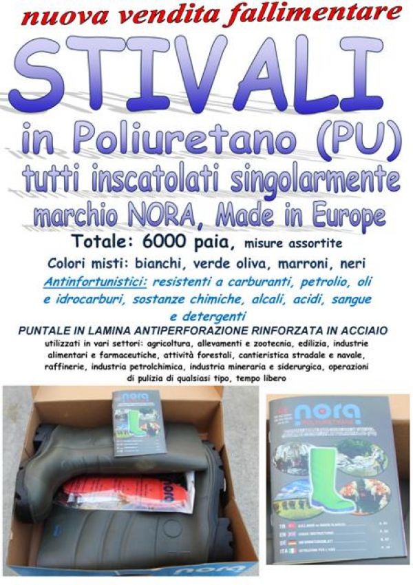 - Stock di stivali in poliuretano, tutti inscatolati singolarmente, made in Europe, marca Nora. Colori misti: bianchi, verde oliva, marroni, neri; stivali da lavoro resistenti a carburanti, petrolio, oli e idrocarburi, sostanze chimiche, alcali, acidi, sangue e detergenti: puntale in lamina antiperforazione rinforzata in acciaio, utilizzati in vari settori: agricoltura, allevamenti e zootecnia, edilizia, industrie alimentari e farmaceutiche, attività forestali, cantieristica stradale e navale, raffinerie, industria petrolchimica, industria mineraria e siderurgica, operazioni di pulizia di qualsiasi tipo, tempo libero Totale 6200 pezzi assortiti. Per info su prezzo ed altro contattare il Sig. BOBBI LUCA al 328/8535881 o i nostri uffici allo 0744/800948